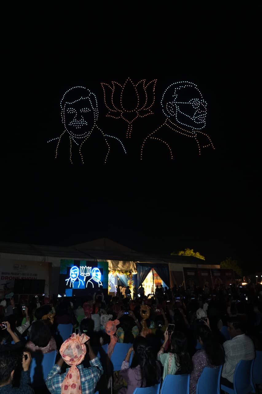மாநிலத்தில் இதுவரை காணப்படாத அளவுக்கு மின்னும் வண்ணமயமான மின்விமானம் (Drone) காட்சி நடை பெற்றது. விழா ஏற்பாடு செ ய்யப்பட்ட இடம் முழுவதும் பசுமையும் மரங்களும் மற்றும் மலர்களால் எழில் கொண்டு சூழப்பட்டு அழகாக காட்சியளித்தது. நூற்றுக்கணக்கான ட்ரோன்கள் ஏரிக்கரையைச் சுற்றி வானில் ஒளி மற்றும் ஒத்திசைவு மிகுந்த பல்வேறு விதமான காட்சிகளை உருவாக்கி. இதில் வியத்தகு காட்சிகளாக இந்திய மாண்புமிகு பிரதமர் நரேந்திர மோடி அவர்களின் உருவம் , மத்திய பிரதேசத்தின் முதல்வர் டாக்டர் மோகன் யாதவ் அவர்களின் உருவம், மற்றும் மாநிலத்தின் ஆட்சி, வேலை வாய்ப்பு, தொழில்துறை வளர்ச்சி முக்கிய வளர்ச்சி முயற்சிகள் போன்றவற்றை காட்சிப்படுத்தின.