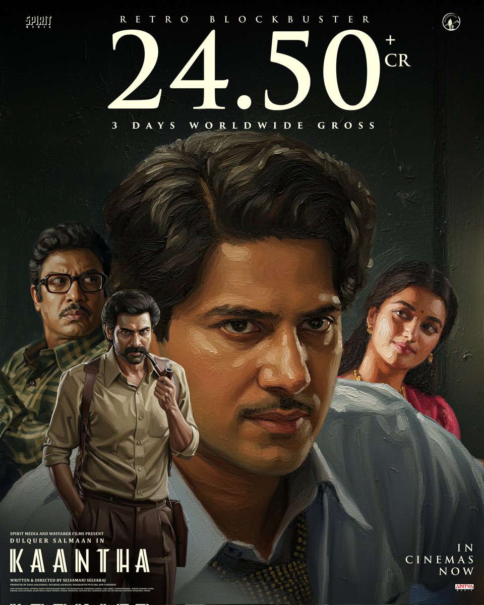 வேஃபாரர் பிலிம்ஸ் மற்றும் ராணா ஸ்பிரிட் மீடியா நிறுவனங்கள் இணைந்து தயாரித்துள்ள ‘காந்தா’ திரைப்படம், கடந்த 14 ஆம் தேதி திரையரங்குகளில் வெளியானது. தமிழ், தெலுங்கு, மலையாளம் மற்றும் கன்னடம் ஆகிய மொழிகளில் வெளியாகியுள்ள இப்படம் வசூலில் சாதனை படைத்து வருகிறது. ‘காந்தா’ திரைப்படம் கடந்த 3 நாட்களில் ரூ.24.50 கோடிக்கு மேல் வசூலித்ததாக படக்குழு போஸ்டர் வெளியிட்டு அறிவித்துள்ளது.