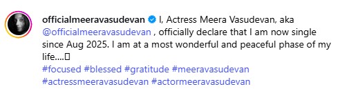 இதுதொடர்பாக அவர் வெளியிட்டுள்ள சமூக வலைதள பதிவில் குறிப்பிட்டிருப்பதாவது; “2025 ஆகஸ்ட் முதல் நான் சிங்கிளாகி விட்டேன். என் வாழ்க்கையின் அழகான மற்றும் அமைதியான கட்டத்தில் நான் இருக்கிறேன்” என்று குறிப்பிட்டுள்ளார்.